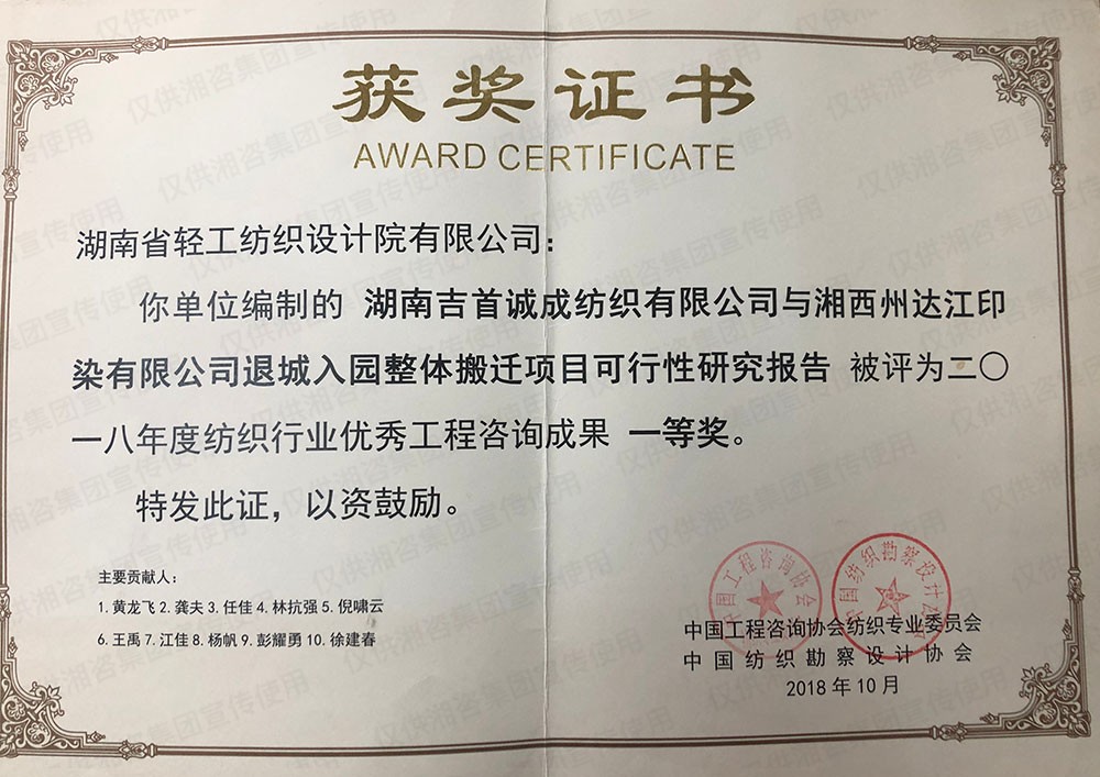 中國紡織勘察設計協會優秀工程咨詢成果一等獎