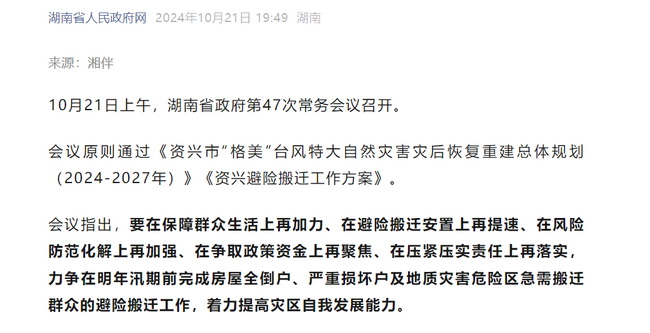 10月21日上午,湖南省政府第47次常務(wù)會(huì)議召開,會(huì)議原則通過了由湘咨集團(tuán)編制的《資興市“格美”臺(tái)風(fēng)特大自然災(zāi)害災(zāi)后恢復(fù)重建總體規(guī)劃(2024-2027······