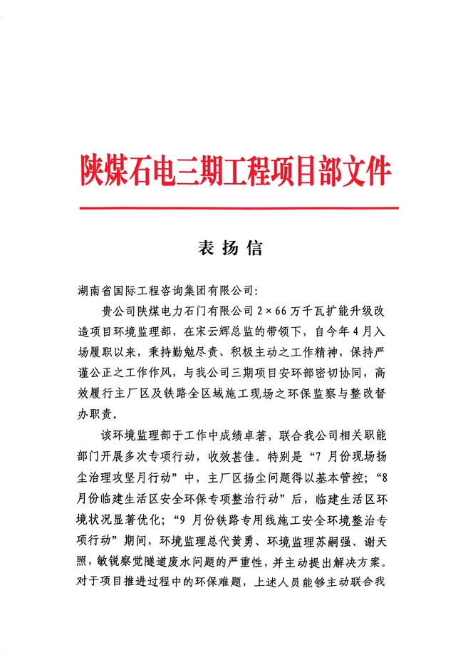 近日,由湘咨集團(tuán)環(huán)境保護(hù)咨詢事業(yè)部承接的陜煤石門電廠三期環(huán)境監(jiān)理項(xiàng)目收到建設(shè)單位發(fā)來的表揚(yáng)信,來信對(duì)集團(tuán)監(jiān)理人員在項(xiàng)目建設(shè)階段的辛勤付出和卓越表現(xiàn)表示由衷······